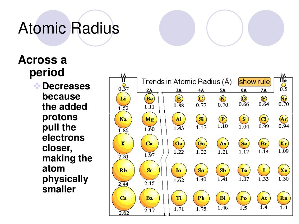 Atomic Radius Across a period • Decreases because the added protonspull the electrons closer, making the atom physically smaller