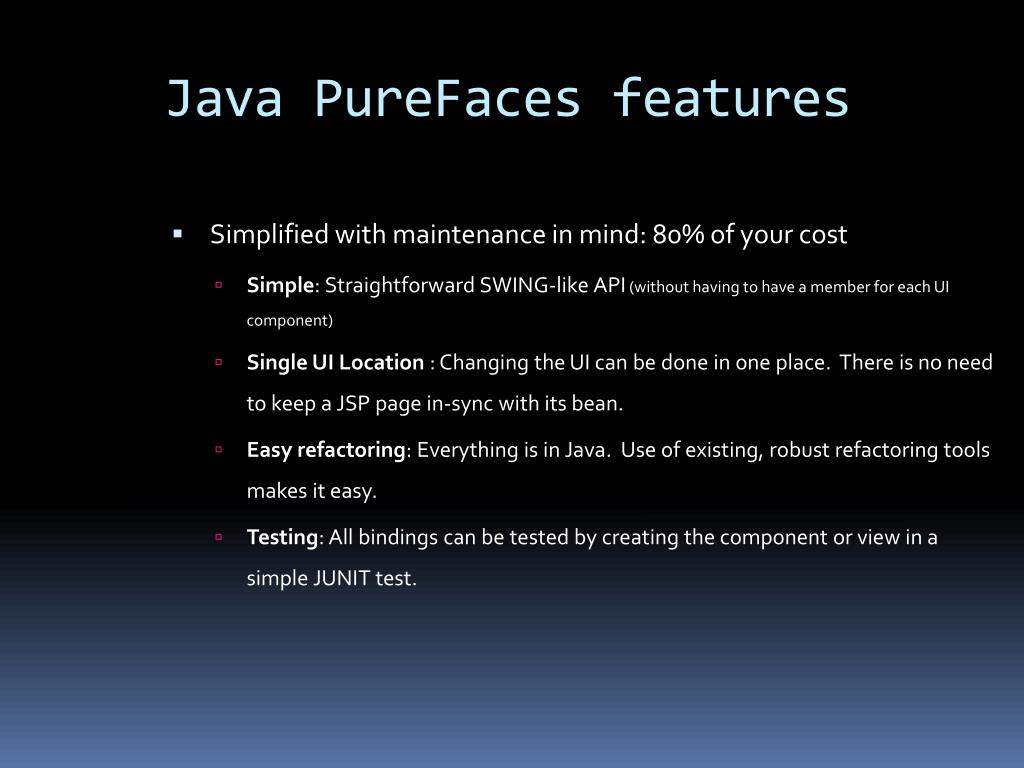 Java PureFaces features • Simplified with maintenance in mind: 80% of your cost • Simple: Straightforward SWING-like API (without having to have a member for each UI component) • Single UI Location : Changing the UI can be done in one place. There is no need to keep a JSP page in-sync with its bean. • Easy refactoring: Everything is in Java. Use of existing, robust refactoring tools makes it easy. • Testing: All bindings can be tested by creating the component or view in a simple JUNIT test.
