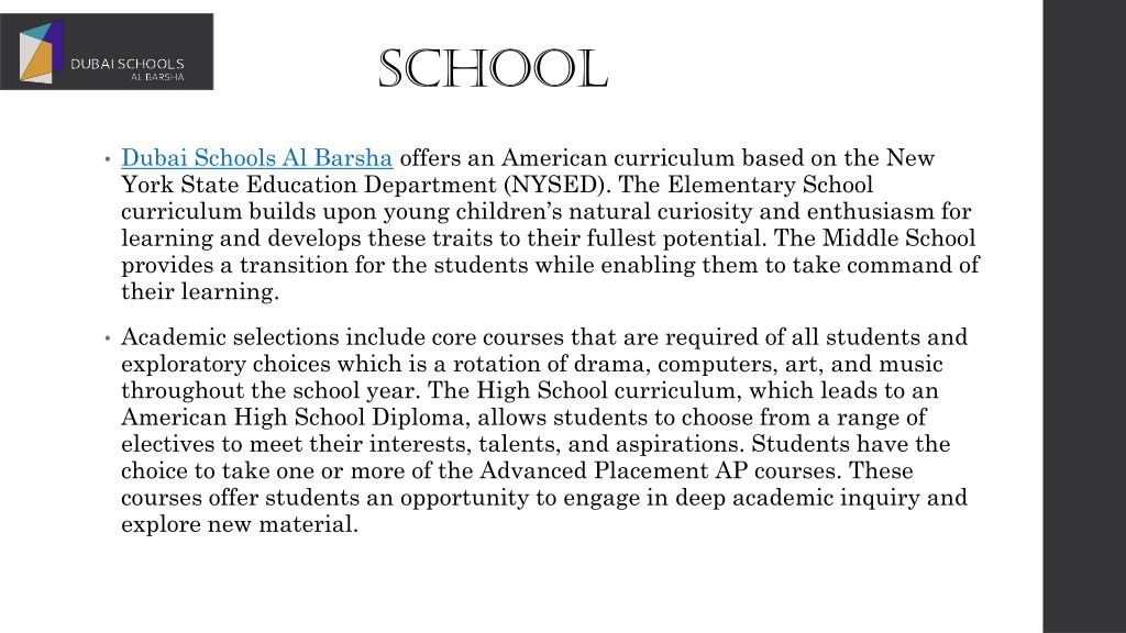 ABOUT US • Dubai Schools Al Barsha offer an American Curriculum based on the New York State Education Department - NYSED, resulting in an American high school diploma. We strive to empower and inspire students across a variety of abilities and backgrounds. As a result, the curriculum will foster empathy, self-motivation, and pride in every student. • Dubai Schools Al Barsha Project aims to create a mutually beneficial partnership between the government and the private sector. This partnership will ensure Dubai’s aspiration to have 100% of Emirati students enrolled in 'Good+' rated schools by 2021. • We offer a strong American curriculum with excellence in teaching and learning in a caring, inspiring environment. The curriculum will also prepare and inspire students to contribute positively to a rapidly changing world. Students will learn problem-solving skills, critical thinking, and life skills as core values, providing a global perspective and context.