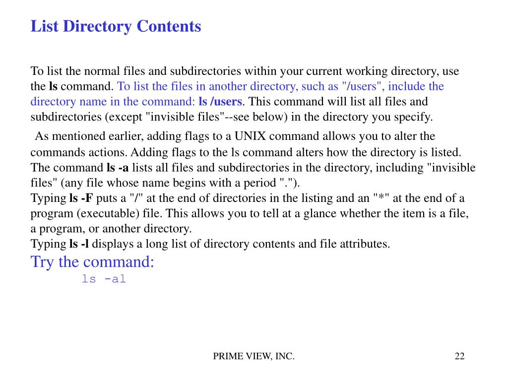 List Directory Contents To list the normal files and subdirectories within your current working directory, use the ls command. To list the files in another directory, such as "/users", include the directory name in the command: ls /users. This command will list all files and subdirectories (except "invisible files"--see below) in the directory you specify. As mentioned earlier, adding flags to a UNIX command allows you to alter the commands actions. Adding flags to the ls command alters how the directory is listed. The command ls -a lists all files and subdirectories in the directory, including "invisible files" (any file whose name begins with a period "."). Typing ls -F puts a "/" at the end of directories in the listing and an "*" at the end of a program (executable) file. This allows you to tell at a glance whether the item is a file, a program, or another directory. Typing ls -l displays a long list of directory contents and file attributes. Try the command: ls -al PRIME VIEW, INC.