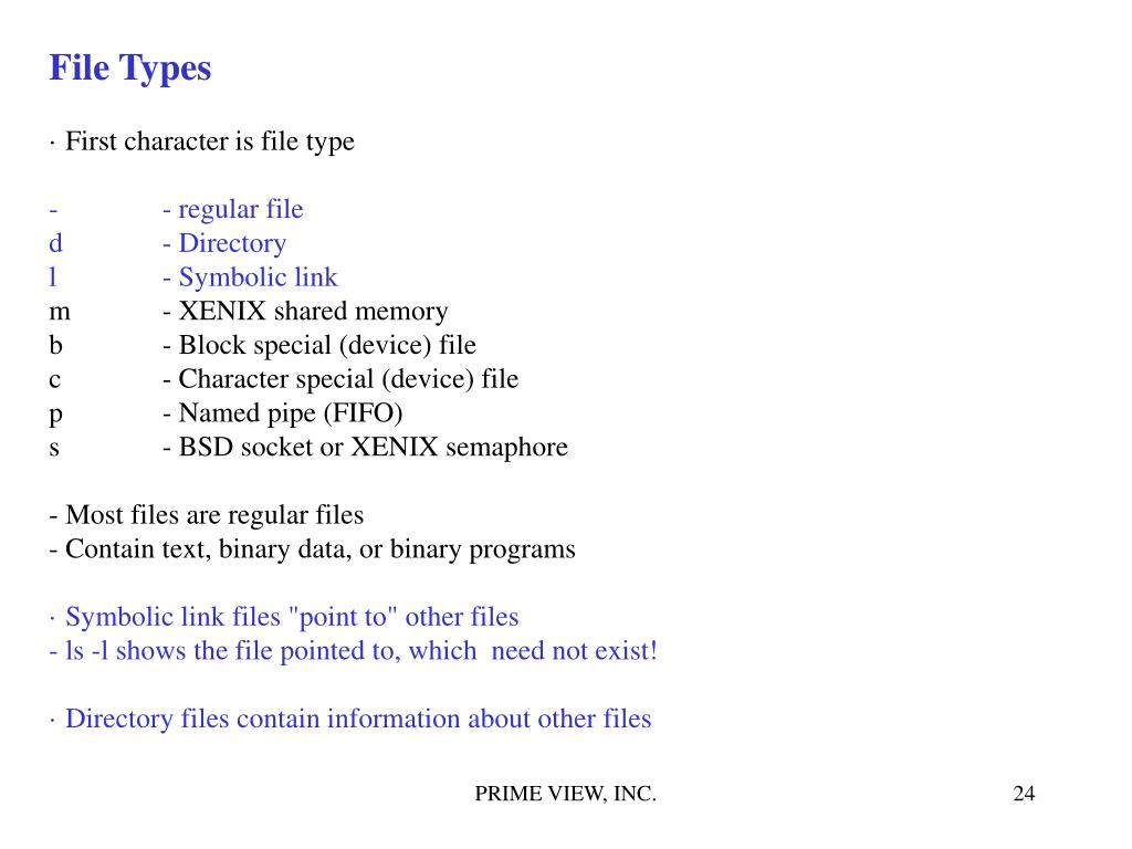 File Types · First character is file type - - regular file d - Directory l - Symbolic link m - XENIX shared memory b - Block special (device) file c - Character special (device) file p - Named pipe (FIFO) s - BSD socket or XENIX semaphore - Most files are regular files - Contain text, binary data, or binary programs · Symbolic link files "point to" other files - ls -l shows the file pointed to, which need not exist! · Directory files contain information about other files PRIME VIEW, INC.