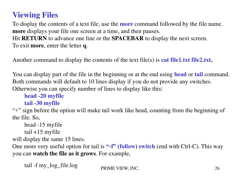 Viewing Files • To display the contents of a text file, use themore command followed by the file name. more displays your file one screen at a time, and then pauses. Hit RETURN to advance one line or the SPACEBAR to display the next screen. To exit more, enter the letter q. • Another command to display the contents of the text file(s) is cat file1.txt file2.txt. • You can display part of the file in the beginning or at the end usingheadortailcommand. Both commands will default to 10 lines display if you do not provide any switches. Otherwise you can specify number of lines to display like this: • head -20 myfile • tail -30 myfile • “+” sign before the option will make tail work like head, counting from the beginning of the file. So, • head -15 myfile • tail +15 myfile • will display the same 15 lines. • One more very useful option for tail is“-f” (follow) switch(end with Ctrl-C). This way you can watch the file as it grows. For example, • tail -f my_log_file.log PRIME VIEW, INC.