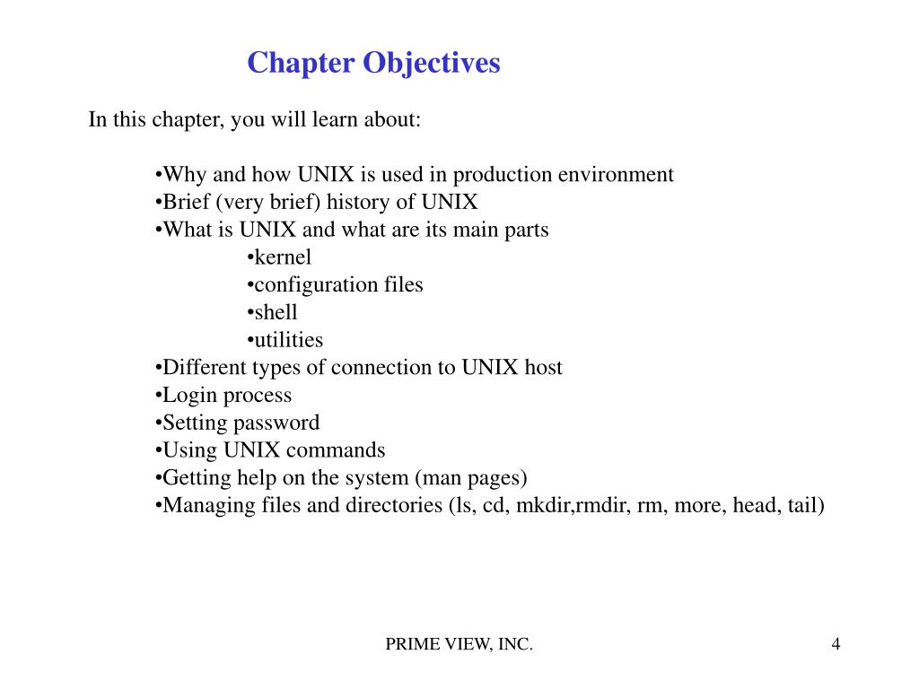 Chapter Objectives • In this chapter, you will learn about: • Why and how UNIX is used in production environment • Brief (very brief) history of UNIX • What is UNIX and what are its main parts • kernel • configuration files • shell • utilities • Different types of connection to UNIX host • Login process • Setting password • Using UNIX commands • Getting help on the system (man pages) • Managing files and directories (ls, cd, mkdir,rmdir, rm, more, head, tail) PRIME VIEW, INC.