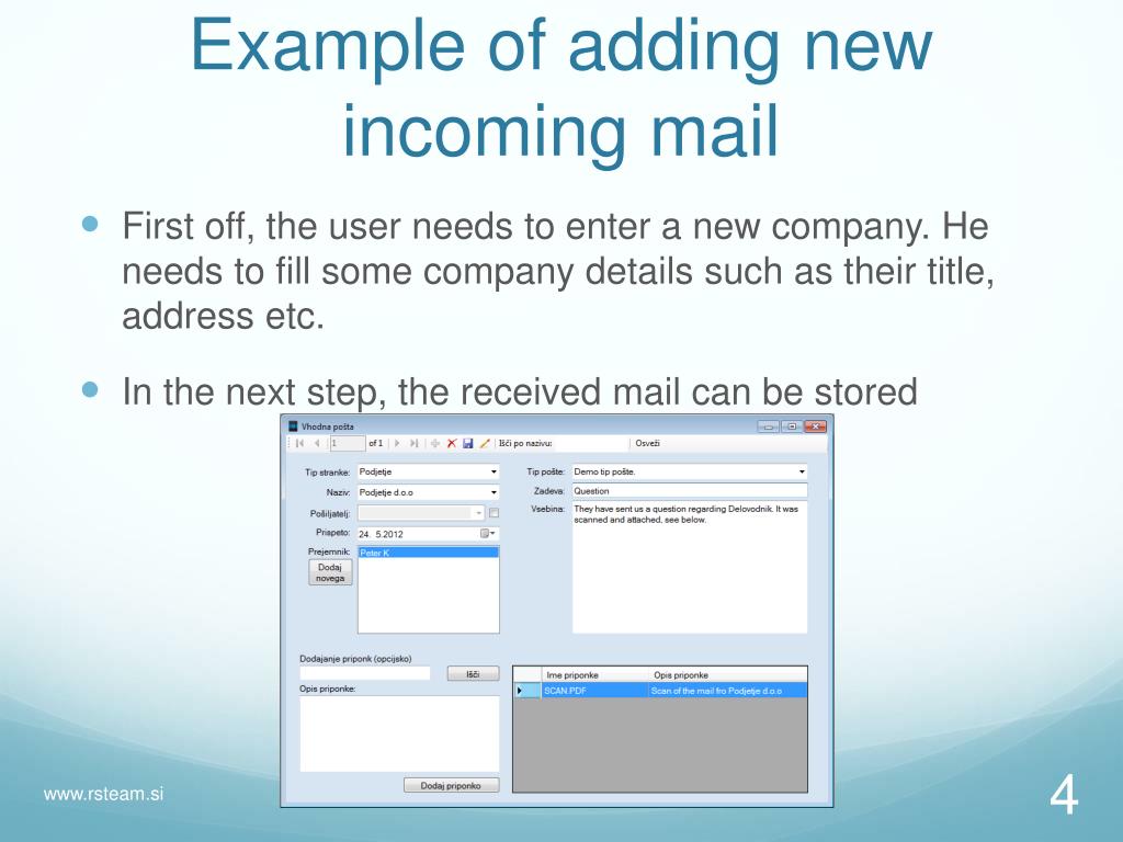 Example of adding new incoming mail • First off, the user needs to enter a new company. He needs to fill some company details such as their title, address etc. • In the next step, the received mail can be stored www.rsteam.si