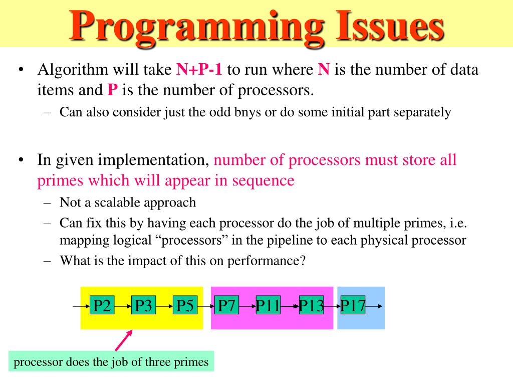 Programming Issues P13 P17 P2 P3 P5 P7 P11 • Algorithm will take N+P-1 to run where N is the number of data items and P is the number of processors. • Can also consider just the odd bnys or do some initial part separately • In given implementation, number of processors must store all primes which will appear in sequence • Not a scalable approach • Can fix this by having each processor do the job of multiple primes, i.e. mapping logical “processors” in the pipeline to each physical processor • What is the impact of this on performance? processor does the job of three primes