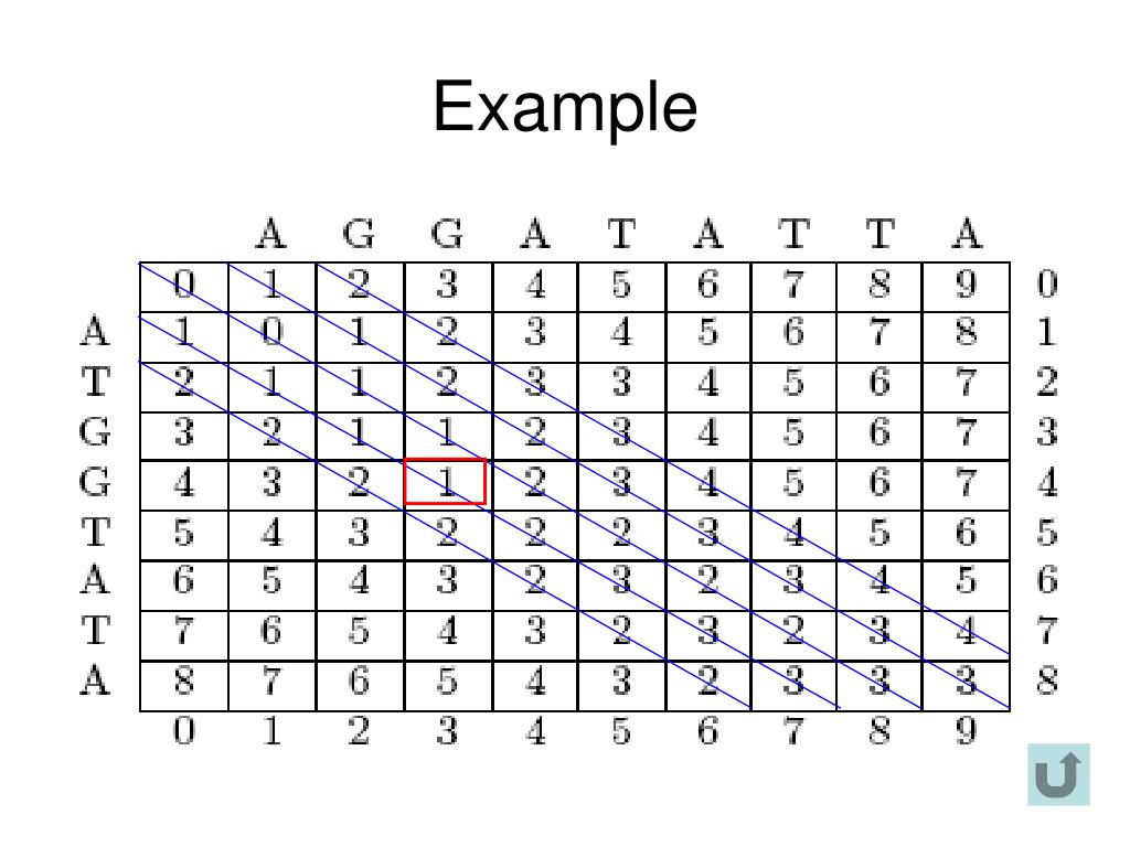 Approximate String Matching • The longest prefix approximate match problem is, given strings A, B, and threshold k, to find for each l the length m(l) and the set of indices r such that ED(Am(l),B[l...r] )≦k, m(l) = max{p[0,m] : r[l, n], ED(Ap,B[l,...,r]≦k}.