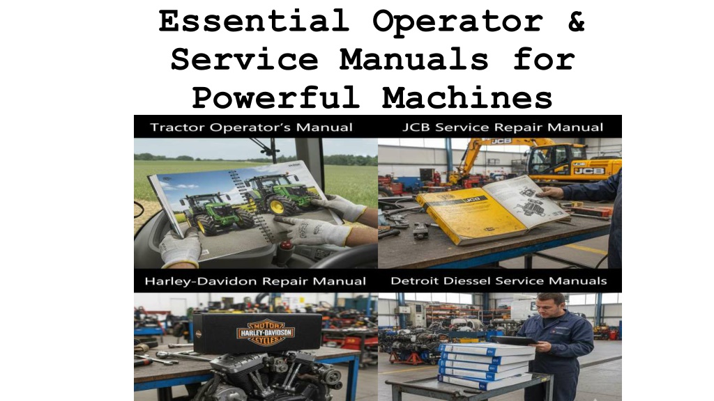 In industries like agriculture, construction, motorcycling, and heavy transport, machines operate under extreme conditions. Having access to the right documentation ensures safety, efficiency, and long-term performance. Manuals such as the Tractor Operator’s Manual, JCB Service Repair Manual, Harley-Davidson Repair Manual, and Detroit Diesel Service Manuals provide accurate instructions directly from manufacturers, helping operators and technicians reduce downtime and avoid costly errors. Tractor Operator’s Manual: Reliable Guidance for Daily Use The Tractor Operator’s Manual is designed for farmers and equipment operators who work with tractors on a daily basis. It covers operating controls, safety instructions, routine inspections, maintenance schedules, and proper use of attachments. By following the operator’s manual, users can prevent mechanical damage, improve fuel efficiency, and ensure safe working conditions in the field. This manual is especially valuable for new operators as well as experienced professionals who want consistent performance. JCB Service Repair Manual: Expert-Level Construction Maintenance The JCB Service Repair Manual is a comprehensive technical resource for maintaining and repairing JCB construction equipment. It includes detailed troubleshooting steps, hydraulic and electrical diagrams, component specifications, and repair procedures. Mechanics rely on this manual to diagnose faults accurately and complete repairs according to factory standards. Using official JCB service manuals helps extend machine life and ensures reliable performance on demanding job sites.