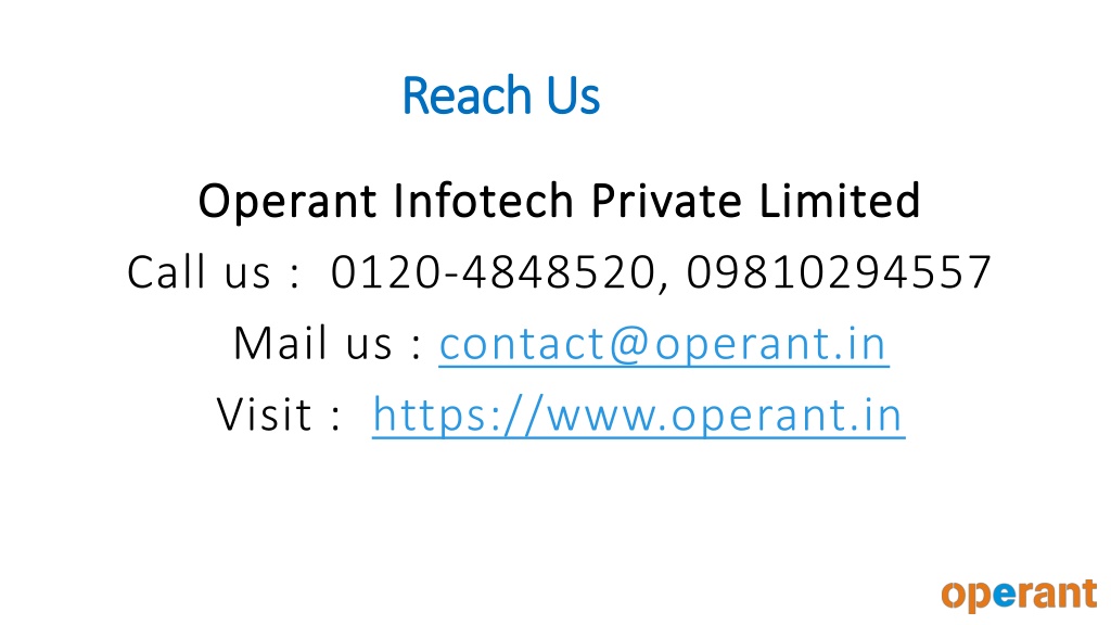 7. Reach Us Operant Infotech Private Limited Call us : 0120-4848520, 09810294557 Mail us : contact@operant.in Visit : https://www.operant.in