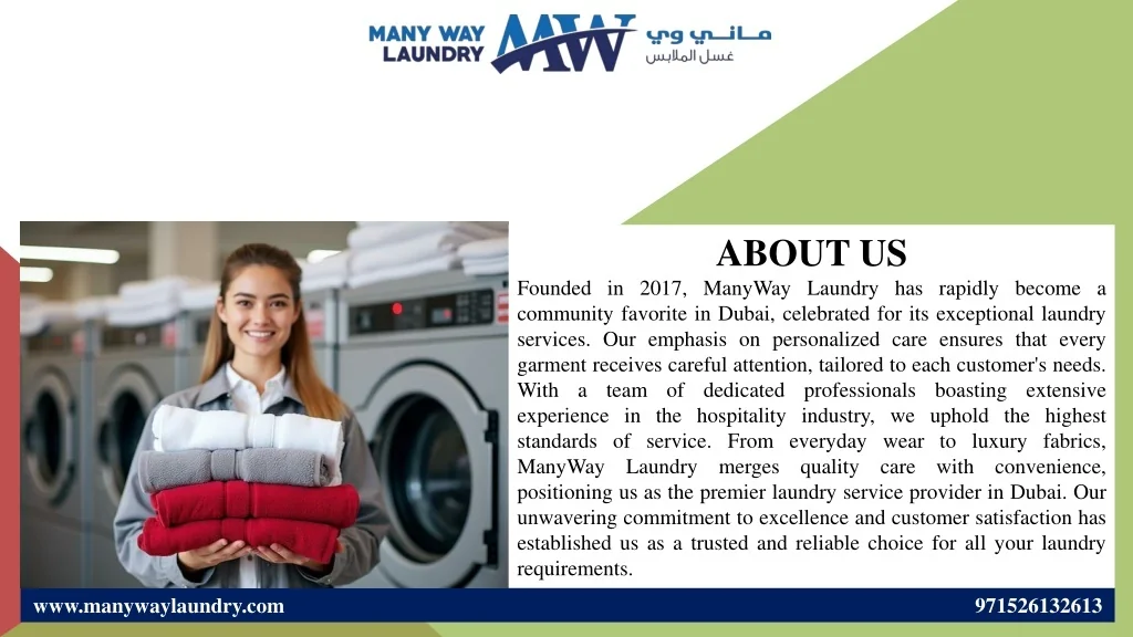 ABOUT US Founded in 2017, ManyWay Laundry has rapidly become a community favorite in Dubai, celebrated for its exceptional laundry services. Our emphasis on personalized care ensures that every garment receives careful attention, tailored to each customer's needs. With a team of dedicated professionals boasting extensive experience in the hospitality industry, we uphold the highest standards of service. From everyday wear to luxury fabrics, ManyWay Laundry merges quality care with convenience, positioning us as the premier laundry service provider in Dubai. Our unwavering commitment to excellence and customer satisfaction has established us as a trusted and reliable choice for all your laundry requirements. www.manywaylaundry.com 971526132613