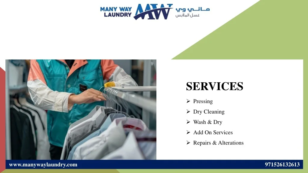 SERVICES Pressing Dry Cleaning Wash & Dry Add On Services Repairs & Alterations www.manywaylaundry.com 971526132613