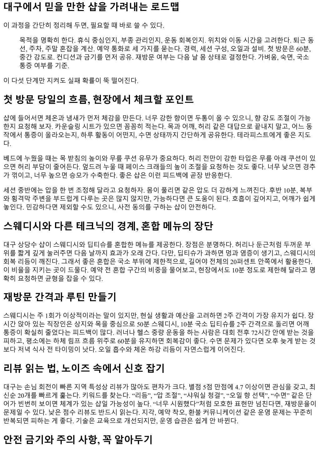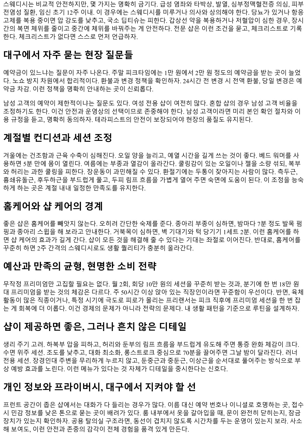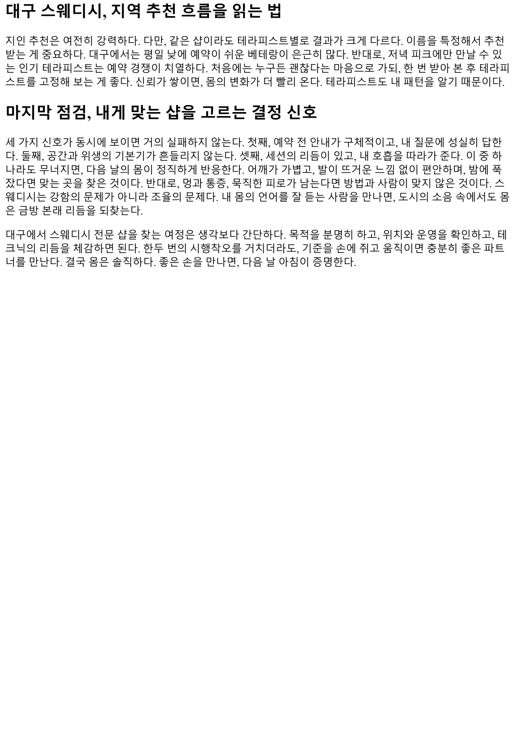 대구스웨디시, 지역추천흐름을읽는법 지인추천은여전히강력하다. 다만, 같은샵이라도테라피스트별로결과가크게다르다. 이름을특정해서추천 받는게중요하다. 대구에서는평일낮에예약이쉬운베테랑이은근히많다. 반대로, 저녁피크에만만날수있 는인기테라피스트는예약경쟁이치열하다. 처음에는누구든괜찮다는마음으로가되, 한번받아본후테라피 스트를고정해보는게좋다. 신뢰가쌓이면, 몸의변화가더빨리온다. 테라피스트도내패턴을알기때문이다. 마지막점검, 내게맞는샵을고르는결정신호 세가지신호가동시에보이면거의실패하지않는다. 첫째, 예약전안내가구체적이고, 내질문에성실히답한 다. 둘째, 공간과위생의기본기가흔들리지않는다. 셋째, 세션의리듬이있고, 내호흡을따라가준다. 이중하 나라도무너지면, 다음날의몸이정직하게반응한다. 어깨가가볍고, 발이뜨거운느낌없이편안하며, 밤에푹 잤다면맞는곳을찾은것이다. 반대로, 멍과통증, 묵직한피로가남는다면방법과사람이맞지않은것이다. 스 웨디시는강함의문제가아니라조율의문제다. 내몸의언어를잘듣는사람을만나면, 도시의소음속에서도몸 은금방본래리듬을되찾는다. 대구에서스웨디시전문샵을찾는여정은생각보다간단하다. 목적을분명히하고, 위치와운영을확인하고, 테 크닉의리듬을체감하면된다. 한두번의시행착오를거치더라도, 기준을손에쥐고움직이면충분히좋은파트 너를만난다. 결국몸은솔직하다. 좋은손을만나면, 다음날아침이증명한다.