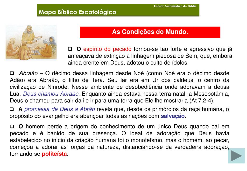 Estudo Sistemático da Bíblia Mapa Bíblico Escatológico As Condições do Mundo. • Oespírito do pecado tornou-se tão forte e agressivo que já ameaçava de extinção a linhagem piedosa de Sem, que, embora ainda crente em Deus, adotou o culto de ídolos. • Abraão – O décimo dessa linhagem desde Noé (como Noé era o décimo desde Adão) era Abraão, o filho de Terá. Seu lar era em Ur dos caldeus, o centro da civilização de Ninrode. Nesse ambiente de desobediência onde adoravam a deusa Lua, Deus chamou Abraão. Enquanto ainda estava nessa terra natal, a Mesopotâmia, Deus o chamou para sair dali e ir para uma terra que Ele lhe mostraria (At 7.2-4). • Apromessa de Deus a Abrão revela que, desde os primórdios da raça humana, o propósito do evangelho era abençoar todas as nações com salvação. • O homem perde a origem do conhecimento de um único Deus quando cai em pecado e é banido de sua presença. O ideal de adoração que Deus havia estabelecido no início da criação humana foi o monoteísmo, mas o homem, ao pecar, começou a adorar as forças da natureza, distanciando-se da verdadeira adoração, tornando-se politeísta.