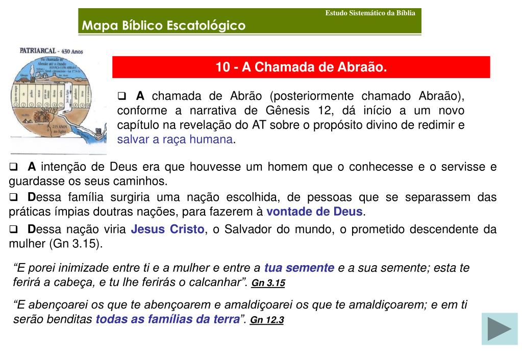 Estudo Sistemático da Bíblia Mapa Bíblico Escatológico 10 - A Chamada de Abraão. • A chamada de Abrão (posteriormente chamado Abraão), conforme a narrativa de Gênesis 12, dá início a um novo capítulo na revelação do AT sobre o propósito divino de redimir e salvar a raça humana. • A intenção de Deus era que houvesse um homem que o conhecesse e o servisse e guardasse os seus caminhos. • Dessa família surgiria uma nação escolhida, de pessoas que se separassem das práticas ímpias doutras nações, para fazerem à vontade de Deus. • Dessa nação viria Jesus Cristo, o Salvador do mundo, o prometido descendente da mulher (Gn 3.15). “E porei inimizade entre ti e a mulher e entre a tua semente e a sua semente; esta te ferirá a cabeça, e tu lhe ferirás o calcanhar”.Gn 3.15 “E abençoarei os que te abençoarem e amaldiçoarei os que te amaldiçoarem; e em ti serão benditas todas as famílias da terra”.Gn 12.3