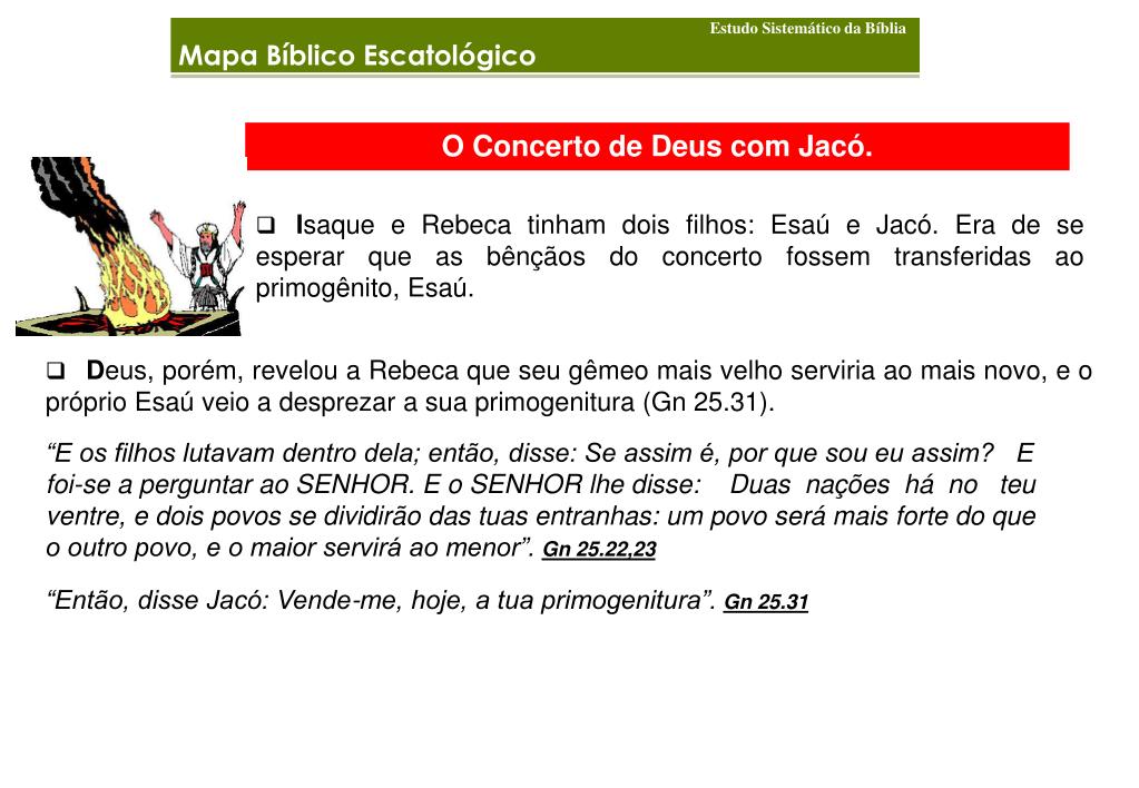 Estudo Sistemático da Bíblia Mapa Bíblico Escatológico O Concerto de Deus com Jacó. • Isaque e Rebeca tinham dois filhos: Esaú e Jacó. Era de se esperar que as bênçãos do concerto fossem transferidas ao primogênito, Esaú. • Deus, porém, revelou a Rebeca que seu gêmeo mais velho serviria ao mais novo, e o próprio Esaú veio a desprezar a sua primogenitura (Gn 25.31). “E os filhos lutavam dentro dela; então, disse: Se assim é, por que sou eu assim? E foi-se a perguntar ao SENHOR. E o SENHOR lhe disse: Duas nações há no teu ventre, e dois povos se dividirão das tuas entranhas: um povo será mais forte do que o outro povo, e o maior servirá ao menor”.Gn 25.22,23 “Então, disse Jacó: Vende-me, hoje, a tua primogenitura”.Gn 25.31