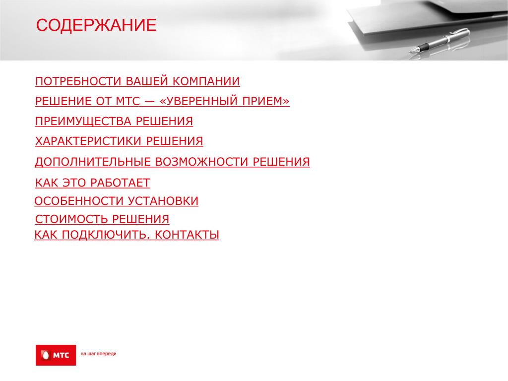 СОДЕРЖАНИЕ ПОТРЕБНОСТИ ВАШЕЙ КОМПАНИИ РЕШЕНИЕ ОТ МТС — «УВЕРЕННЫЙ ПРИЕМ» ПРЕИМУЩЕСТВА РЕШЕНИЯ ХАРАКТЕРИСТИКИ РЕШЕНИЯ ДОПОЛНИТЕЛЬНЫЕ ВОЗМОЖНОСТИ РЕШЕНИЯ КАК ЭТО РАБОТАЕТ ОСОБЕННОСТИ УСТАНОВКИ СТОИМОСТЬ РЕШЕНИЯ КАК ПОДКЛЮЧИТЬ. КОНТАКТЫ