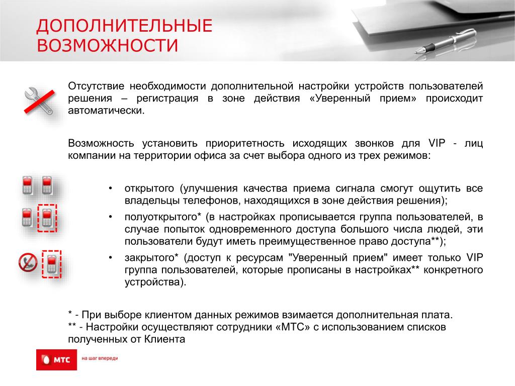 ДОПОЛНИТЕЛЬНЫЕ ВОЗМОЖНОСТИ Отсутствие необходимости дополнительной настройки устройств пользователей решения – регистрация в зоне действия «Уверенный прием» происходит автоматически. Возможность установить приоритетность исходящих звонков для VIP - лиц компании на территории офиса за счет выбора одного из трех режимов: открытого (улучшения качества приема сигнала смогут ощутить все владельцы телефонов, находящихся в зоне действия решения); полуоткрытого* (в настройках прописывается группа пользователей, в случае попыток одновременного доступа большого числа людей, эти пользователи будут иметь преимущественное право доступа**); закрытого* (доступ к ресурсам "Уверенный прием" имеет только VIP группа пользователей, которые прописаны в настройках** конкретного устройства). * - При выборе клиентом данных режимов взимается дополнительная плата. ** - Настройки осуществляют сотрудники «МТС» с использованием списков полученных от Клиента