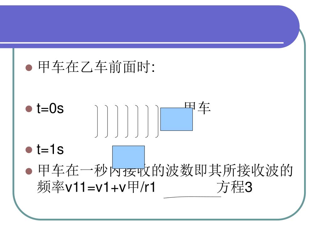甲车在乙车前面时: • t=0s 甲车 • t=1s • 甲车在一秒内接收的波数即其所接收波的频率v11=v1+v甲/r1 方程3