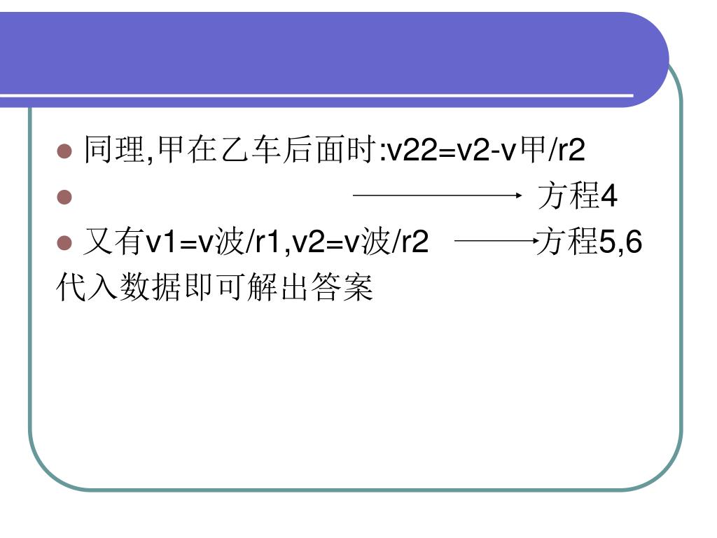同理,甲在乙车后面时:v22=v2-v甲/r2 • 方程4 • 又有v1=v波/r1,v2=v波/r2 方程5,6 代入数据即可解出答案