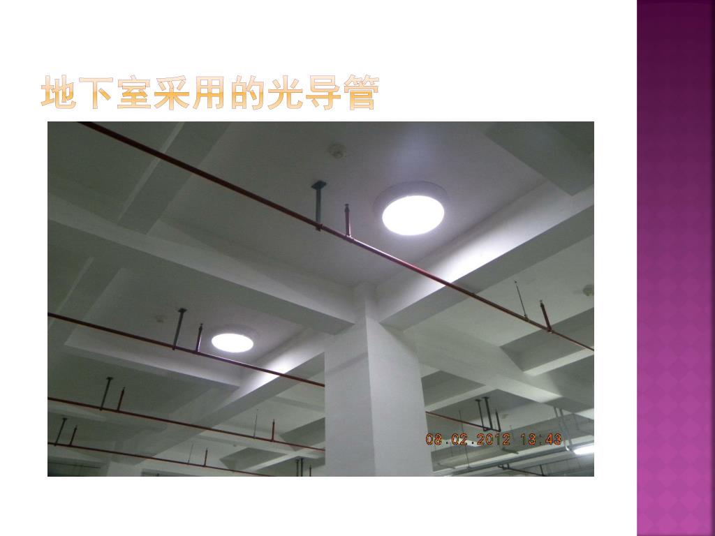 六、自然采光设计 • 采用侧面采光和顶部采光(B、C、F区设置采光顶); • 改善室内照明质量和自然光利用效果,保证75%的室内空间采光系数>2%,起到较好的节能效果; • 采用光导管自然采光技术,将室外的自然光引人地下空间; • 照明系统每年可节电34%。
