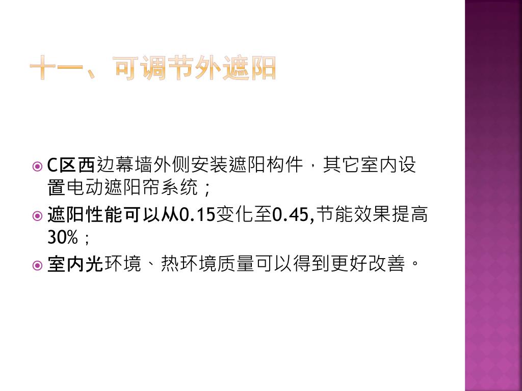 十一、可调节外遮阳 • C区西边幕墙外侧安装遮阳构件,其它室内设置电动遮阳帘系统; • 遮阳性能可以从0.15变化至0.45,节能效果提高30%; • 室内光环境、热环境质量可以得到更好改善。