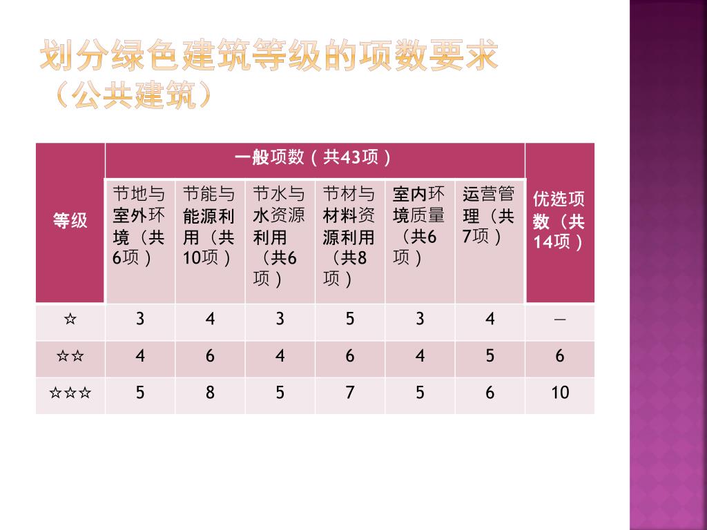 绿色建筑评价与等级划分 • 绿色建筑评价指标体系由节地与室外环境、节能与能源利用、节水与水资源利用、节材与材料资源利用、室内环境质量和运营管理六类指标组成。每类指标包括控制项、一般项与优选项。 • 绿色建筑应满足《绿色建筑评价标准》(GB/T50378—2006)中住宅建筑或公共建筑中所有控制项的要求,并按满足一般项数和优选项数的程度,划分为三个等级。