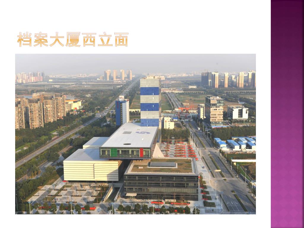 档案综合大厦项目概况 • 建筑面积:83000 m2 (含地下室) • 主要功能:档案储存、管理,规划展示,成 就展示,房产交易、会议接待等 • 投资总额:66000万元 • 质量目标:确保“扬子杯”,争创“鲁班奖” • 绿色建筑:国家绿色建筑三星标准