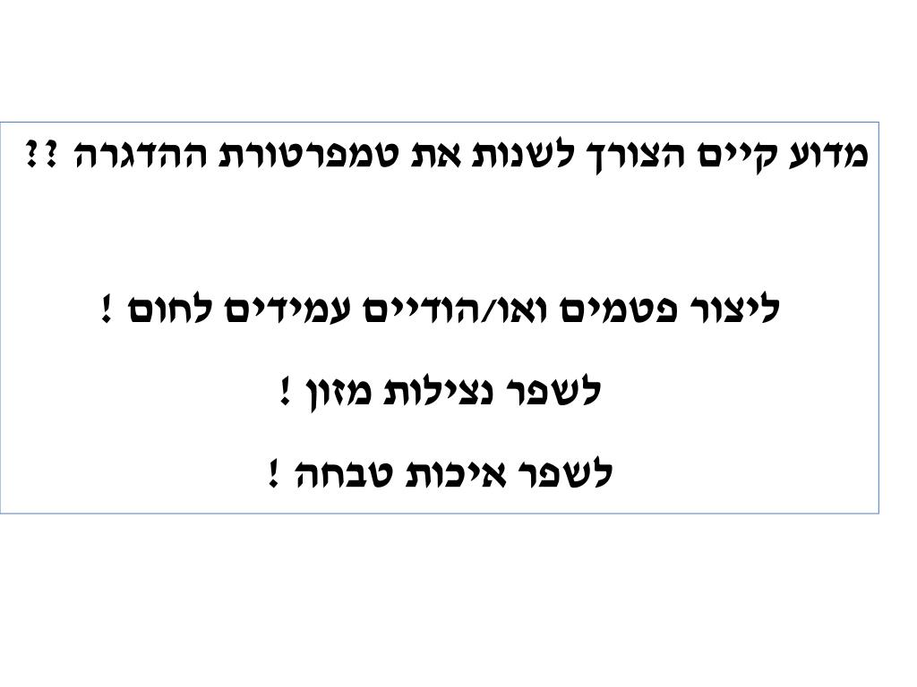 מדוע קיים הצורך לשנות את טמפרטורת ההדגרה ?? ליצור פטמים ואו/הודיים עמידים לחום ! לשפר נצילות מזון ! לשפר איכות טבחה !