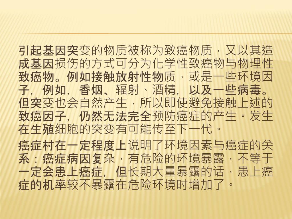 引起基因突变的物质被称为致癌物质,又以其造成基因损伤的方式可分为化学性致癌物与物理性致癌物。例如接触放射性物质,或是一些环境因子,例如,香烟、辐射、酒精,以及一些病毒。但突变也会自然产生,所以即使避免接触上述的致癌因子,仍然无法完全预防癌症的产生。发生在生殖细胞的突变有可能传至下一代。引起基因突变的物质被称为致癌物质,又以其造成基因损伤的方式可分为化学性致癌物与物理性致癌物。例如接触放射性物质,或是一些环境因子,例如,香烟、辐射、酒精,以及一些病毒。但突变也会自然产生,所以即使避免接触上述的致癌因子,仍然无法完全预防癌症的产生。发生在生殖细胞的突变有可能传至下一代。 癌症村在一定程度上说明了环境因素与癌症的关系:癌症病因复杂,有危险的环境暴露,不等于一定会患上癌症,但长期大量暴露的话,患上癌症的机率较不暴露在危险环境时增加了。