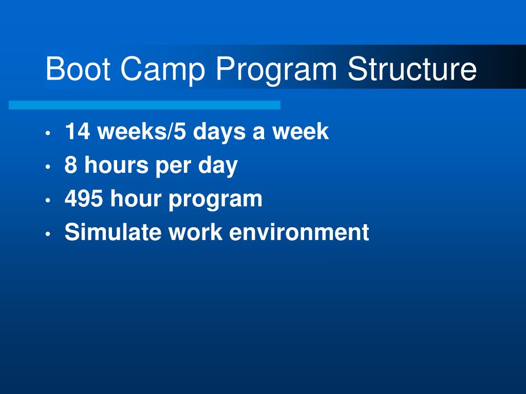 Boot Camp Program Structure • 14 weeks/5 days a week • 8 hours per day • 495 hour program • Simulate work environment