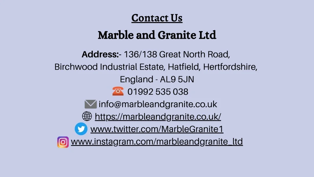 Contact Us Marble and Granite Ltd Address:-136/138GreatNorthRoad, BirchwoodIndustrialEstate,Hatfield,Hertfordshire, England - AL95JN 01992535038 info@marbleandgranite.co.uk https://marbleandgranite.co.uk/ www.twitter.com/MarbleGranite1 www.instagram.com/marbleandgranite_ltd