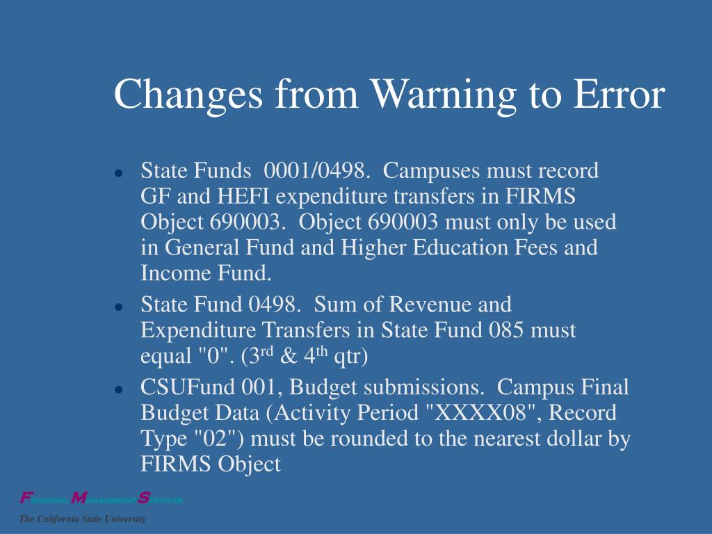 Changes from Warning to Error • State Funds 0001/0498. Campuses must record GF and HEFI expenditure transfers in FIRMS Object 690003. Object 690003 must only be used in General Fund and Higher Education Fees and Income Fund. • State Fund 0498. Sum of Revenue and Expenditure Transfers in State Fund 085 must equal "0". (3rd & 4th qtr) • CSUFund 001, Budget submissions. Campus Final Budget Data (Activity Period "XXXX08", Record Type "02") must be rounded to the nearest dollar by FIRMS Object