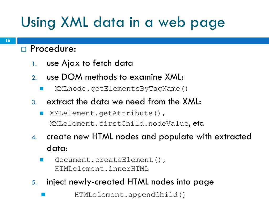 Analyzing a fetched XML file using DOM <?xml version="1.0" encoding="UTF-8"?> <foo bloop="bleep"> <bar/> <baz><quux/></baz> <baz><xyzzy/></baz> </foo>XML We can use DOM properties and methods on ajax.responseXML: // zeroth element of array of length 1 var foo = ajax.responseXML.getElementsByTagName("foo")[0]; // ditto var bar = foo.getElementsByTagName("bar")[0]; // array of length 2 varall_bazzes = foo.getElementsByTagName("baz"); // string "bleep" varbloop = foo.getAttribute("bloop");JS
