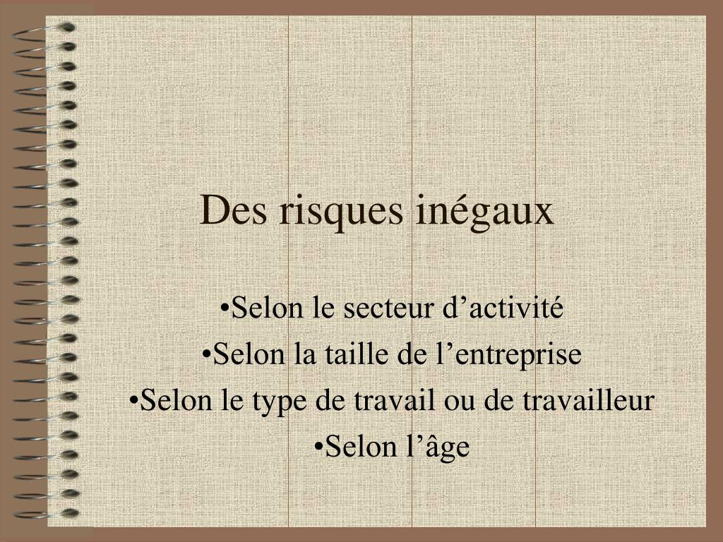 Des risques inégaux Selon le secteur d’activité Selon la taille de l’entreprise Selon le type de travail ou de travailleur Selon l’âge