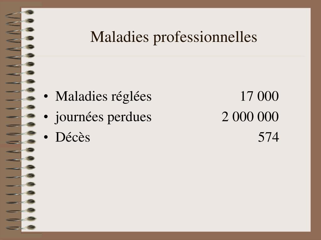 Maladies professionnelles • Maladies réglées 17 000 • journées perdues 2 000 000 • Décès 574
