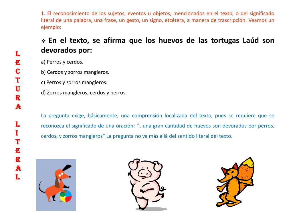 1. El reconocimiento de los sujetos, eventos u objetos, mencionados en el texto, o del significado literal de una palabra, una frase, un gesto, un signo, etcétera, a manera de trascripción. Veamos un ejemplo: • En el texto, se afirma que los huevos de las tortugas Laúd son devorados por: • a) Perros y cerdos. • b) Cerdos y zorros mangleros. • c) Perros y zorros mangleros. • d) Zorros mangleros, cerdos y perros. • La pregunta exige, básicamente, una comprensión localizada del texto, pues se requiere que se reconozca el significado de una oración: “...una gran cantidad de huevos son devorados por perros, cerdos, y zorros mangleros” La pregunta no va más allá del sentido literal del texto. LECTURA LITERAL