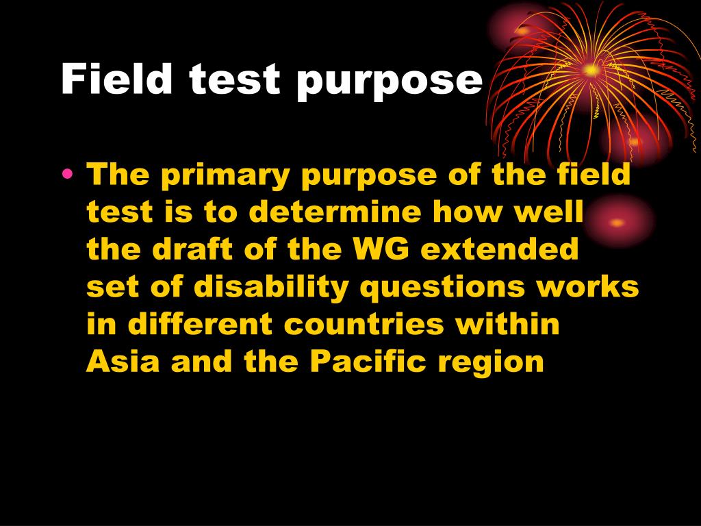 Field test purpose • The primary purpose of the field test is to determine how well the draft of the WG extended set of disability questions works in different countries within Asia and the Pacific region