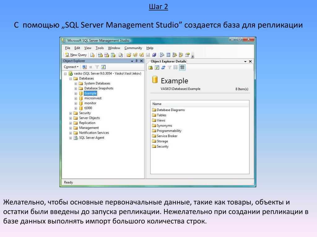 Шаг 2 С помощью „SQL Server Management Studio” создается база для репликации Желательно, чтобы основные первоначальные данные, такие как товары, объекты и остатки были введены до запуска репликации. Нежелательно при создании репликации в базе данных выполнять импорт большого количества строк.