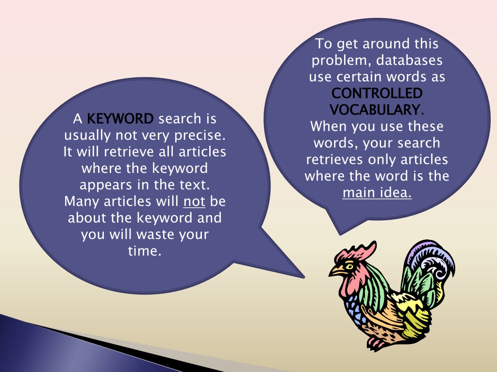 To get around this problem, databases use certain words as CONTROLLED VOCABULARY. When you use these words, your search retrieves only articles where the word is the main idea. A KEYWORDsearch is usually not very precise. It will retrieve all articles where the keyword appears in the text. Many articles will not be about the keyword and you will waste your time.