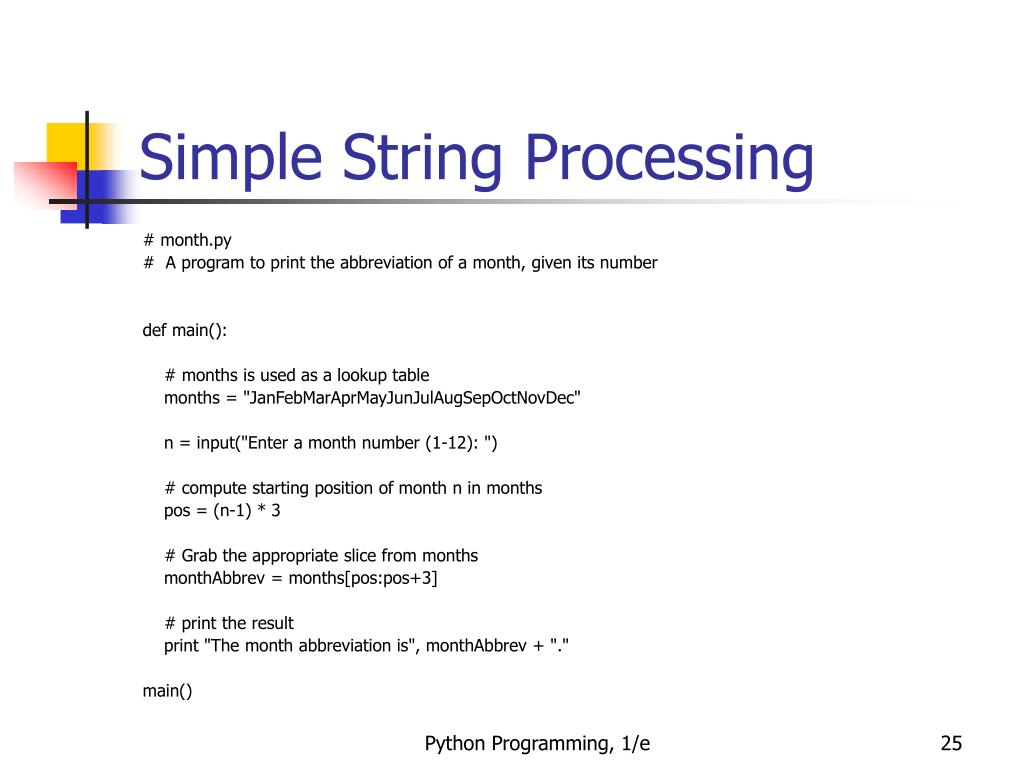 Simple String Processing # month.py # A program to print the abbreviation of a month, given its number def main(): # months is used as a lookup table months = "JanFebMarAprMayJunJulAugSepOctNovDec" n = input("Enter a month number (1-12): ") # compute starting position of month n in months pos = (n-1) * 3 # Grab the appropriate slice from months monthAbbrev = months[pos:pos+3] # print the result print "The month abbreviation is", monthAbbrev + "." main() Python Programming, 1/e