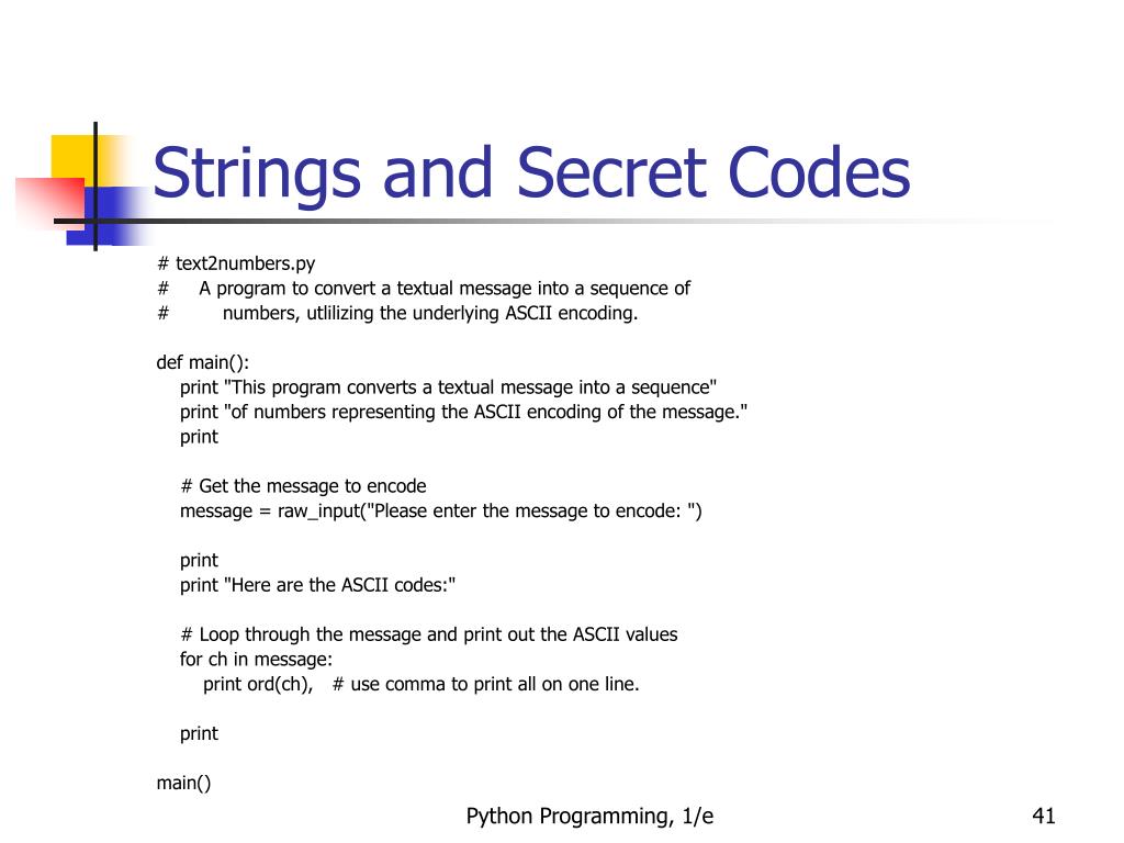 Strings and Secret Codes • Inside the computer, strings are represented as sequences of 1’s and 0’s, just like numbers. • A string is stored as a sequence of binary numbers, one number per character. • It doesn’t matter what value is assigned as long as it’s done consistently. Python Programming, 1/e