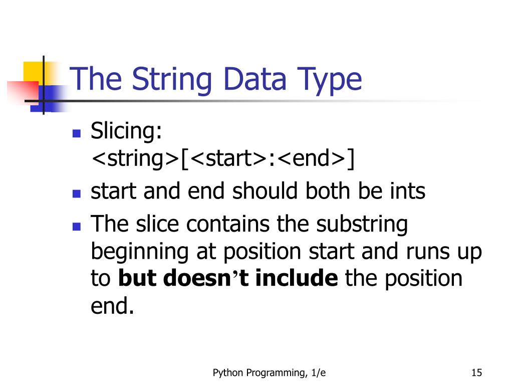 The String Data Type • Slicing:<string>[<start>:<end>] • start and end should both be ints • The slice contains the substring beginning at position start and runs up to but doesn’t include the position end. Python Programming, 1/e