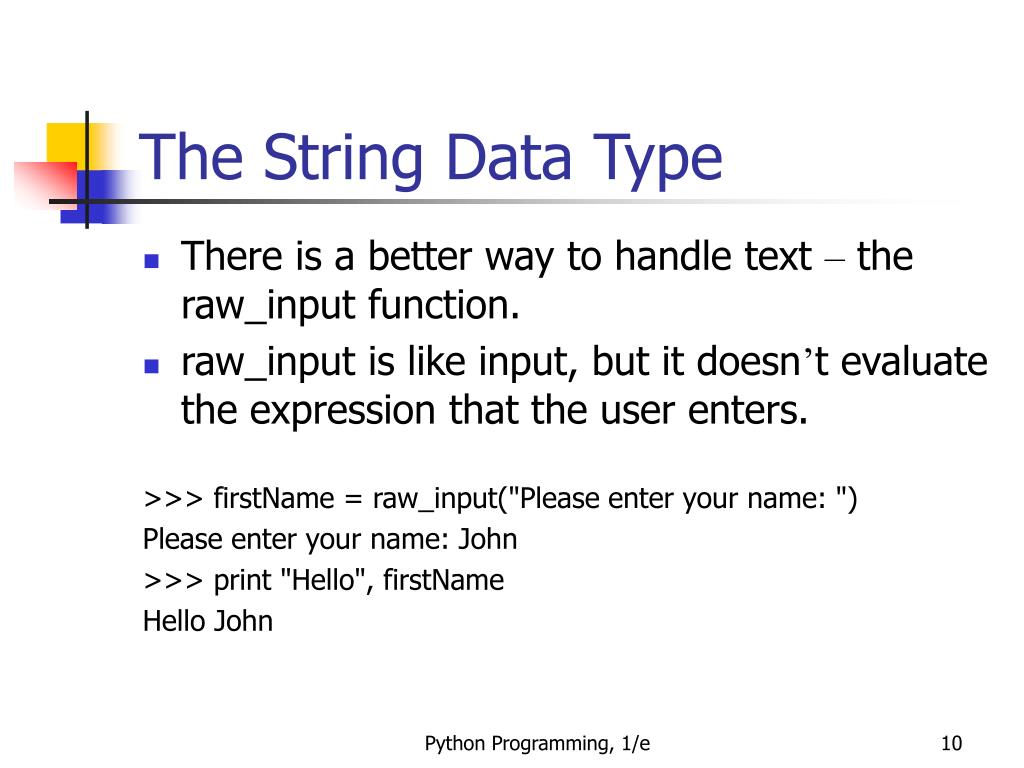 The String Data Type • There is a better way to handle text – the raw_input function. • raw_input is like input, but it doesn’t evaluate the expression that the user enters. >>> firstName = raw_input("Please enter your name: ") Please enter your name: John >>> print "Hello", firstName Hello John Python Programming, 1/e