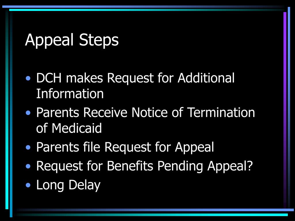 Appeal Steps • DCH makes Request for Additional Information • Parents Receive Notice of Termination of Medicaid • Parents file Request for Appeal • Request for Benefits Pending Appeal? • Long Delay