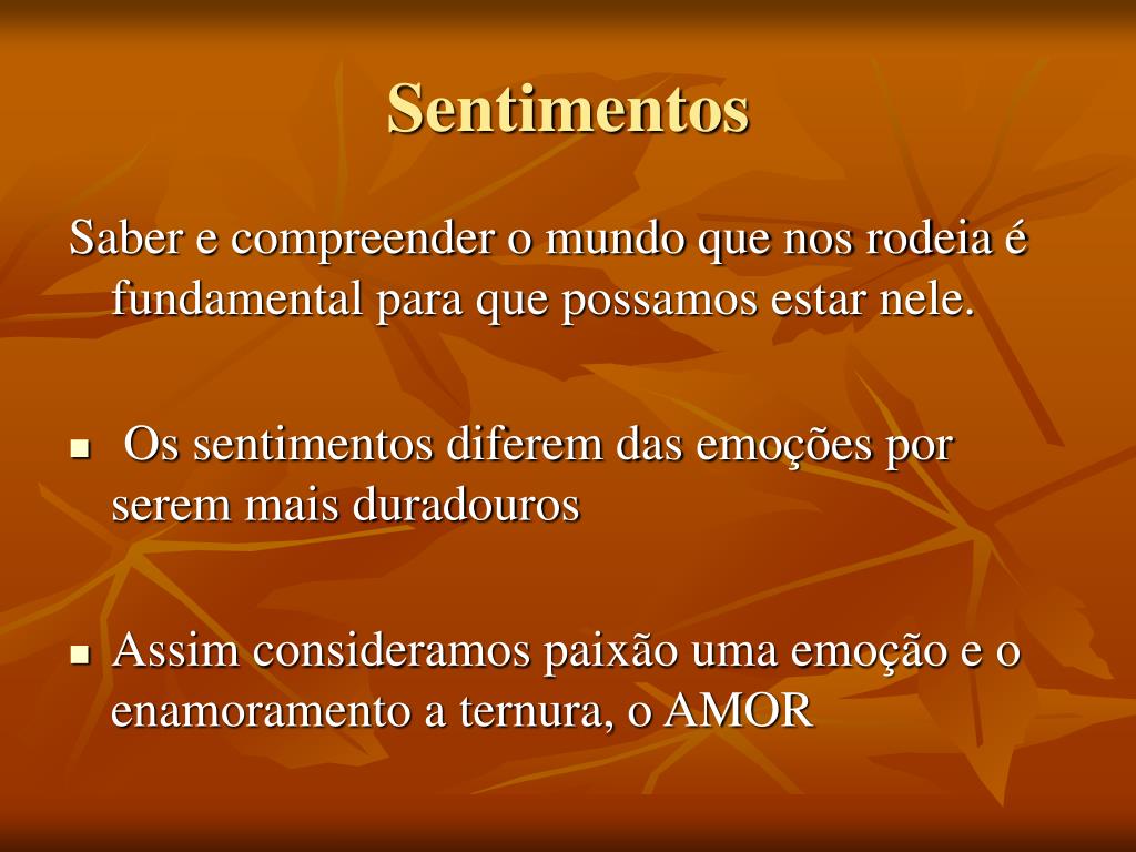 Sentimentos Saber e compreender o mundo que nos rodeia é fundamental para que possamos estar nele. • Os sentimentos diferem das emoções por serem mais duradouros • Assim consideramos paixão uma emoção e o enamoramento a ternura, o AMOR