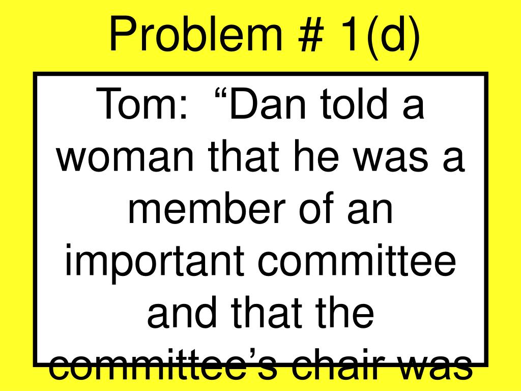 Problem # 1(d) Tom: “Dan told a woman that he was a member of an important committee and that the committee’s chair was a pathological liar.”