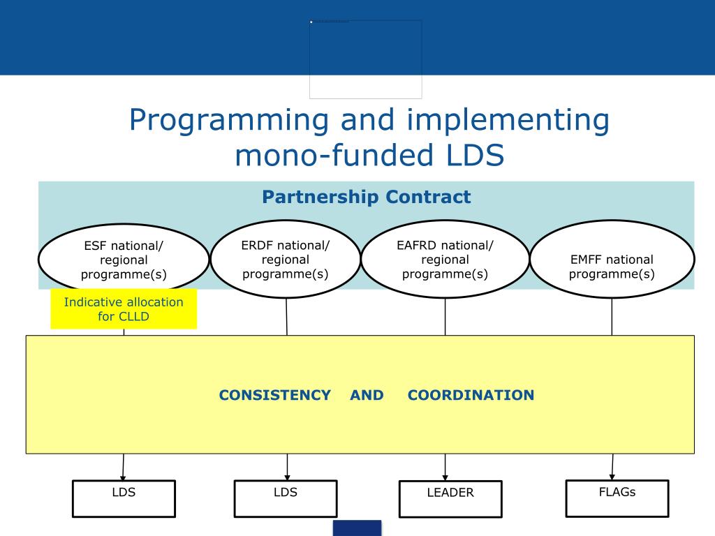 Programming and implementing mono-funded LDS Partnership Contract ERDF national/ regional programme(s) EAFRD national/ regional programme(s) EMFF national programme(s) ESF national/ regional programme(s) Indicative allocation for CLLD CONSISTENCY AND COORDINATION Selection committee Selection committee Selection committee Selection committee FLAGs LDS LDS LEADER