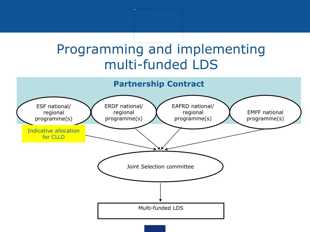Programming and implementing multi-funded LDS Partnership Contract ERDF national/ regional programme(s) EAFRD national/ regional programme(s) EMFF national programme(s) ESF national/ regional programme(s) Indicative allocation for CLLD Joint Selection committee Multi-funded LDS