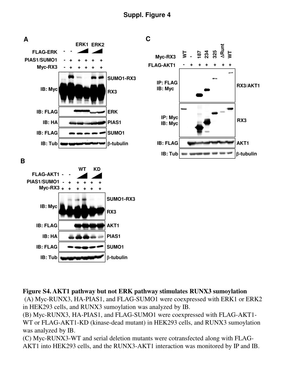 Suppl. Figure 4 C A ERK1 ERK2 DRunt - - 187 FLAG-ERK 234 WT 325 WT - Myc-RX3 - + + + + + PIAS1/SUMO1 - + + + + + + FLAG-AKT1 Myc-RX3 - + + + + + SUMO1-RX3 IP: FLAG IB: Myc RX3/AKT1 IB: Myc RX3 IB: FLAG ERK IP: Myc IB: Myc RX3 IB: HA PIAS1 IB: FLAG SUMO1 IB: FLAG AKT1 IB: Tub b-tubulin IB: Tub b-tubulin B WT KD FLAG-AKT1 - - PIAS1/SUMO1 - + + + + + Myc-RX3 + + + + + + SUMO1-RX3 IB: Myc RX3 IB: FLAG AKT1 PIAS1 IB: HA IB: FLAG SUMO1 IB: Tub b-tubulin Figure S4. AKT1 pathway but not ERK pathway stimulates RUNX3 sumoylation (A) Myc-RUNX3, HA-PIAS1, and FLAG-SUMO1 were coexpressed with ERK1 or ERK2 in HEK293 cells, and RUNX3 sumoylation was analyzed by IB. (B) Myc-RUNX3, HA-PIAS1, and FLAG-SUMO1 were coexpressed with FLAG-AKT1-WT or FLAG-AKT1-KD (kinase-dead mutant) in HEK293 cells, and RUNX3 sumoylation was analyzed by IB. (C) Myc-RUNX3-WT and serial deletion mutants were cotransfected along with FLAG-AKT1intoHEK293 cells, and the RUNX3-AKT1 interaction was monitored by IP and IB.