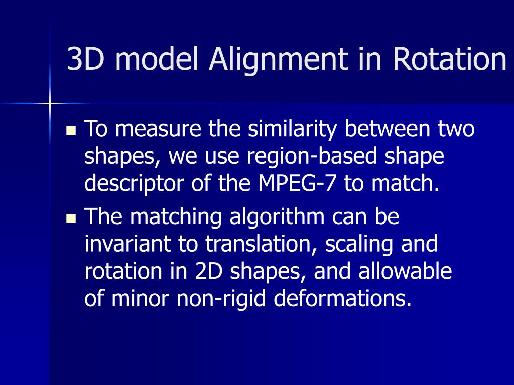 3D model Alignment in Rotation • To measure the similarity between two shapes, we use region-based shape descriptor of the MPEG-7 to match. • The matching algorithm can be invariant to translation, scaling and rotation in 2D shapes, and allowable of minor non-rigid deformations.