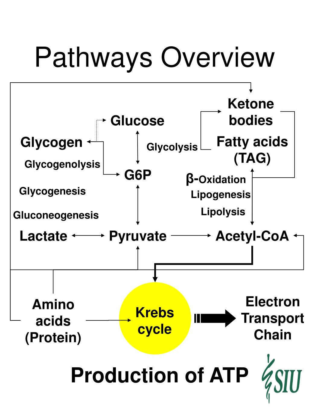 Pathways Overview Ketone bodies Glucose Fatty acids (TAG) Glycogen Glycolysis Glycogenolysis G6P β-Oxidation Glycogenesis Lipogenesis Lipolysis Gluconeogenesis Lactate Pyruvate Acetyl-CoA Electron Transport Chain Amino acids (Protein) Krebs cycle Production of ATP